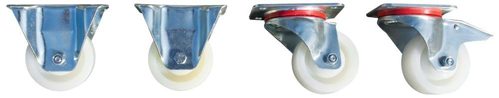 2 Lenk- und 2 Bockrollen aus Polyamid, Durchm. 100 mm, Bauhöhe 125 mm