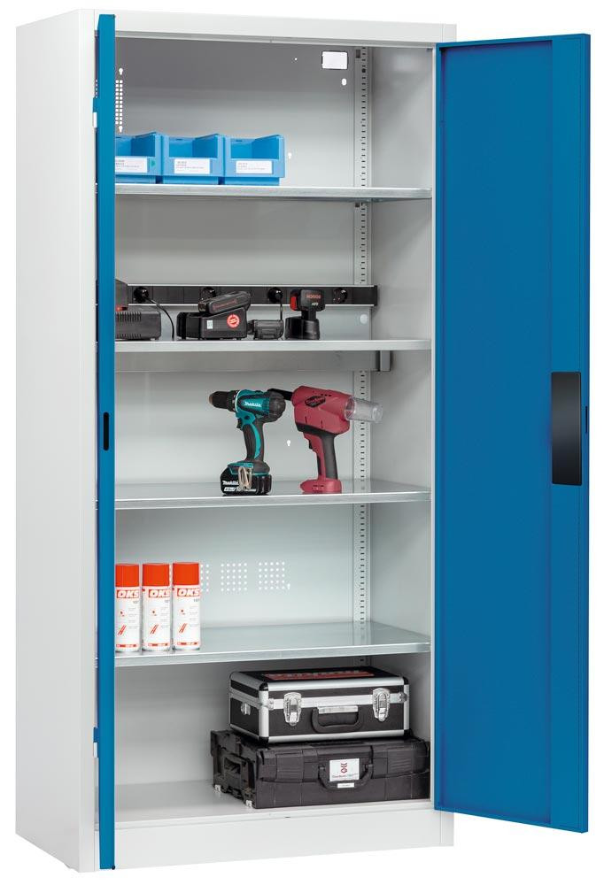 Akkulade-Schrank, Vollblechtüren, BxTxH 930x500x1950 mm, 1 Boden mit 5-fach Steckdosenleiste,3 Einlegeböden, RAL 7035/5010
