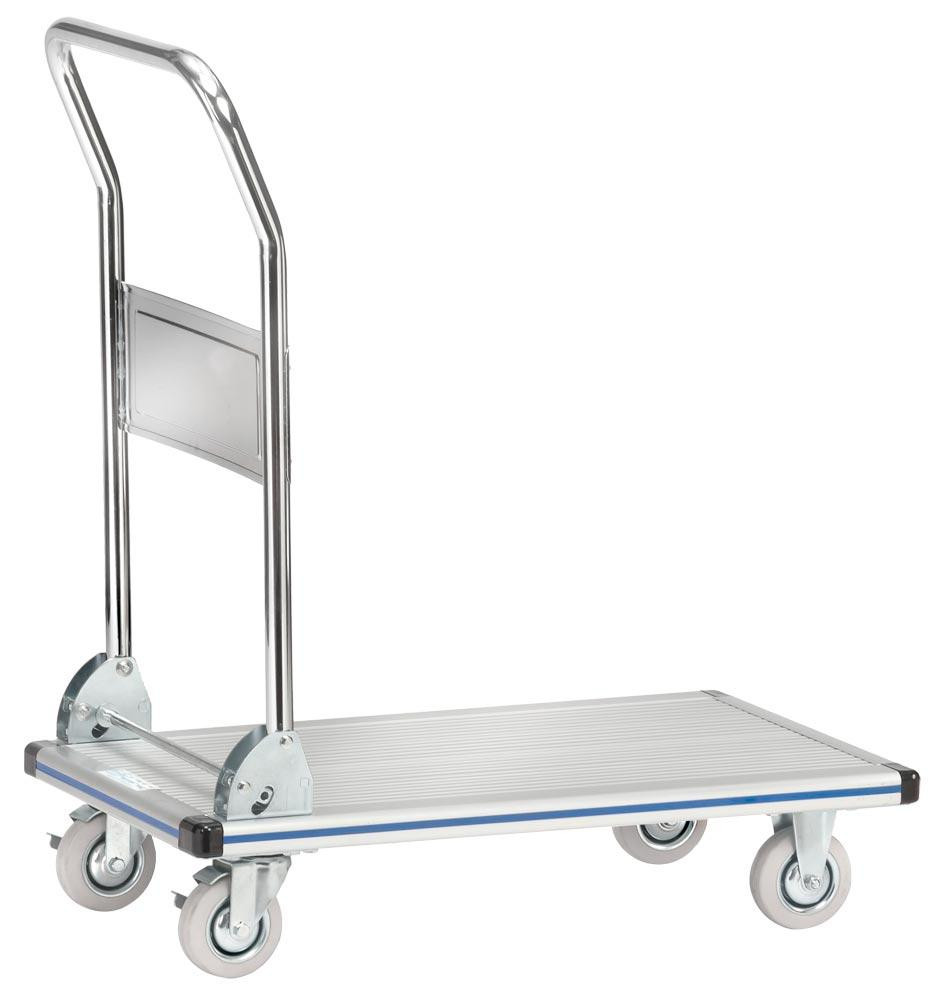 ∙ Plattform aus Aluminium, geschlossen ∙ Mit rutschhemmender Oberfläche ∙ Stabile, abgerundete Kantenprofile ∙ Rohrschiebebügel klappbar, mit breiter Querstrebe ∙ Kräftige Klappbeschläge ∙ 2 Lenk- und 2 Bockrollen ∙ Lenkrollen mit Rad-Feststeller ∙ Vollgummi-Bereifung blaugrau "spurlos" ∙ Naben mit Gleitlagerung