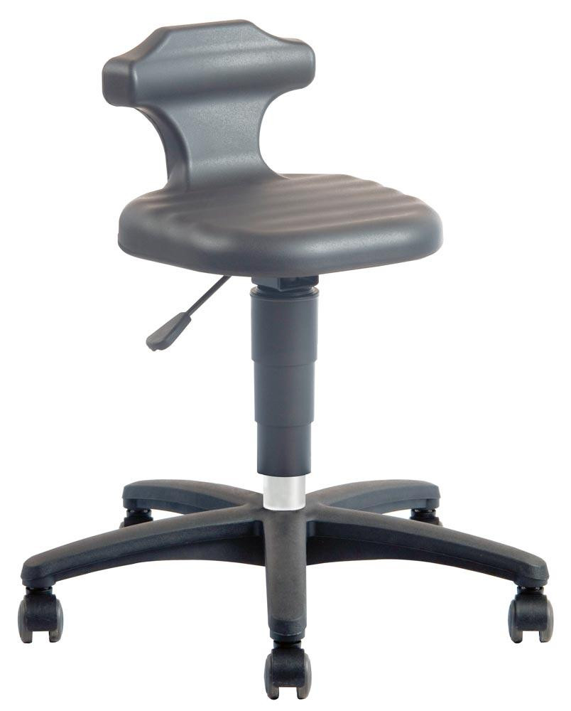 nach DIN 68877 · bedienungsfreundliche Gasfeder- Sitzhöheneinstellung · um 360° drehbar · Sitzfläche mit integrierter Rückenstütze für optimale Entlastung · strukturierte, rutschhemmende Sitz- und Rückenfläche aus softem, schwarzen Integralschaum · Fünffuß-Untergestell aus Kunststoff, flach auslaufend, kipp- und stolpersicher · lastabhängig gebremste Sicherheits-Doppelrollen für harte Böden