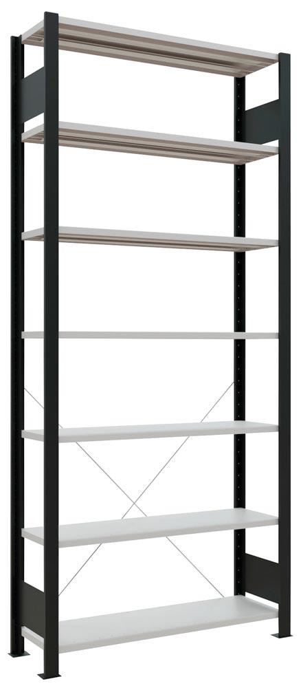· Ständerrahmen mit Tiefenriegeln, pulverbeschichtet in schwarz · Rahmenfronten ungelocht zur attraktiven Optik · Aussteifung durch Kreuzstrebe · Stahlfachböden mit 25 mm hoher Kante, höhenverstellbar im 25-mm-Raster, RAL 7035 lichtgrau · Ohne Anschlagleiste ∙ Zur einseitigen Regalbestückung