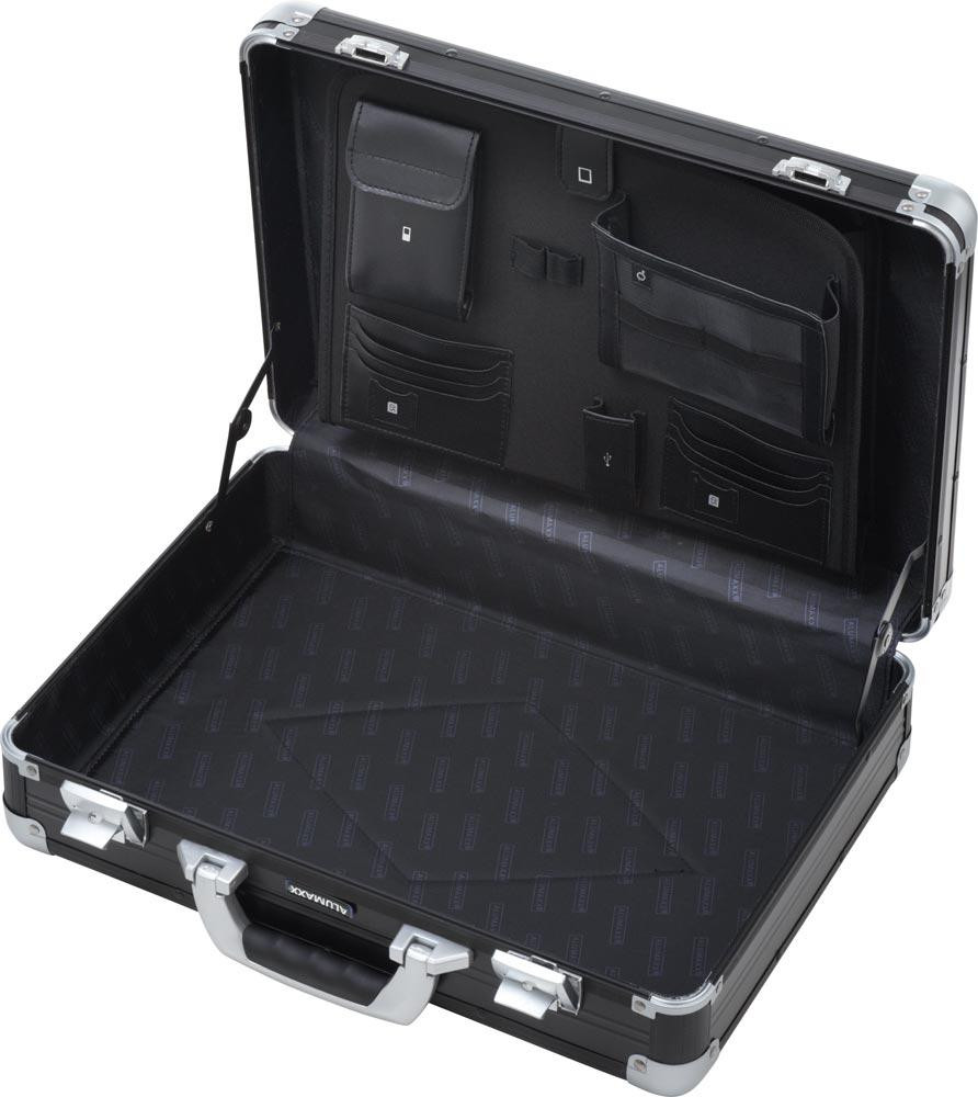 · Aus Aluminium · Ergonomischer Tragegriff · Verstärkte Kanten · Sicheres Schloss-System mit Zweifachschließung und Öffnungsautomatik · Herausnehmbares Inlay mit Laptop-/Tabletfach (bis 13 Zoll), Smartphone Hülle, 2 Stiftschlaufen, 8 Kreditkartenfächern, 2 SD-Karten Fächern, Netzfach und Einsteckfach für USB-Sticks und Kabel, etc.