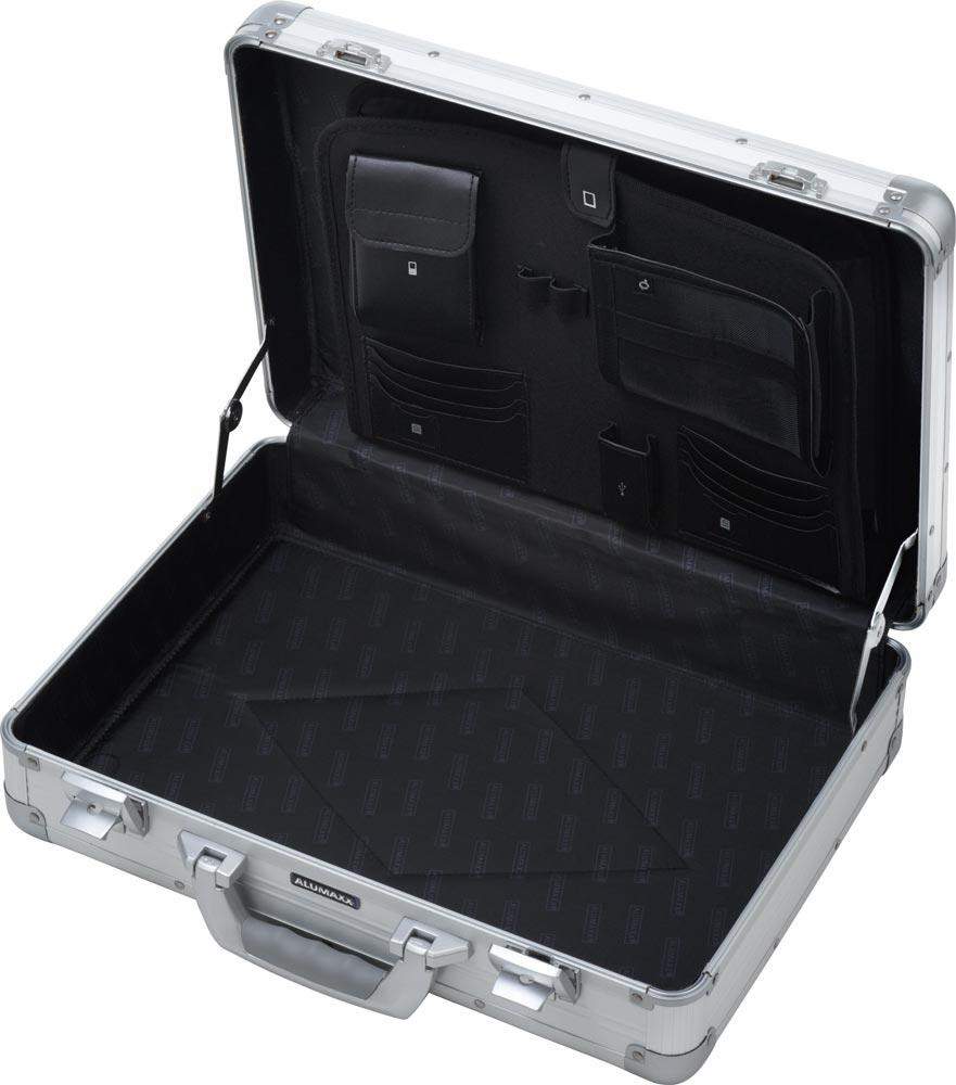 · Aus Aluminium · Ergonomischer Tragegriff · Verstärkte Kanten · Sicheres Schloss-System mit Zweifachschließung und Öffnungsautomatik · Herausnehmbares Inlay mit Laptop-/Tabletfach (bis 13 Zoll), Smartphone Hülle, 2 Stiftschlaufen, 8 Kreditkartenfächern, 2 SD-Karten Fächern, Netzfach und Einsteckfach für USB-Sticks und Kabel, etc.
