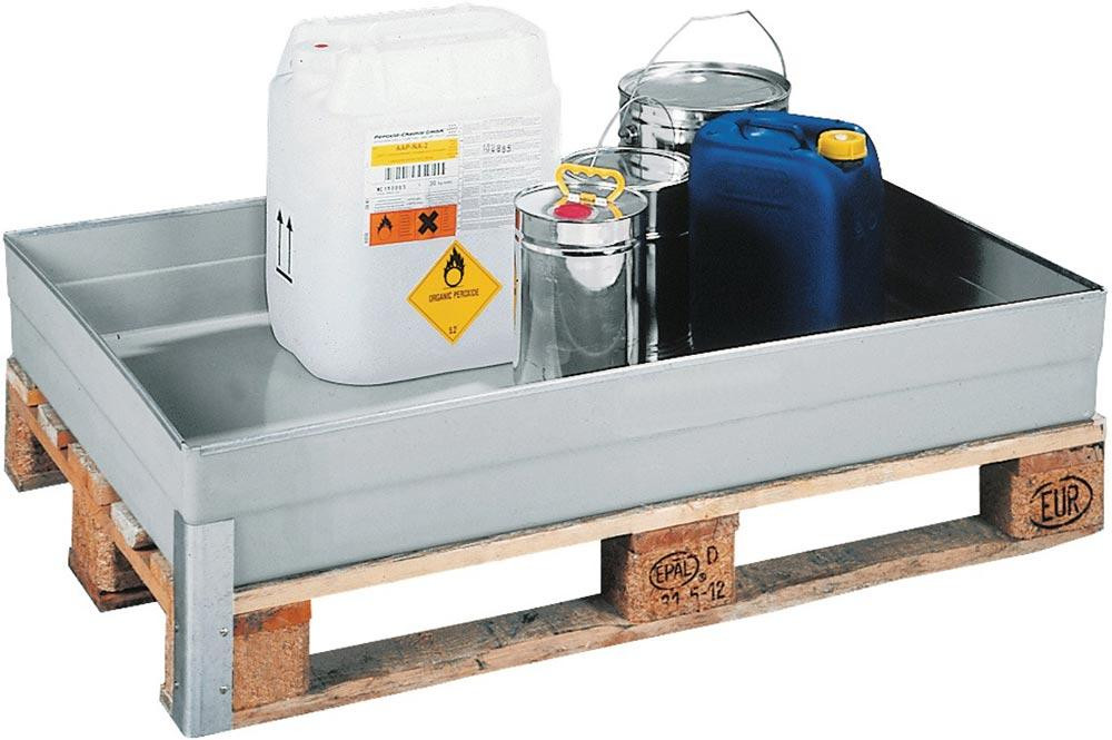 Auffangvolumen 150 l · aus glasfaserverstärktem Kunststoff · mit hoher chemischer Beständigkeit und Stabilität · UV-stabil · durch Korrosionsbeständigkeit dürfen die Wannen direkt auf den Boden gestellt werden · bei geringem Eigengewicht (ca. 9 kg) auf Europalettenmaß abgestimmt · Befestigung auf der Palette über Befestigungswinkel an den Palettenaußenseiten · für 2 x 150-Liter- oder 6 x 60-Liter-Fässer geeignet · Mit bauaufsichtlicher Zulassung Z-40.12-227 des DIBt Berlin für die vorschriftsmäßige Lagerung von stark gewässergefährdenden Stoffen.