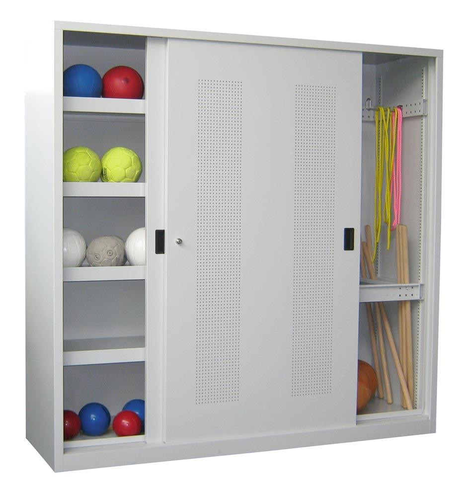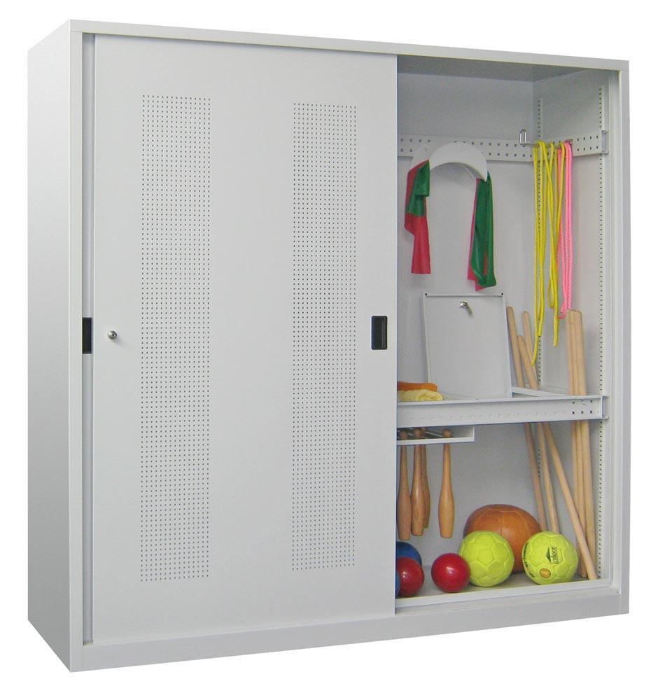 Ballschrank m. Lochblech Schiebetüren, BxTxH 2000x600x1950 mm, 4 Böden, 3 Längs- 4 Quertraversen, Wertfach, Schloss, RAL 7035