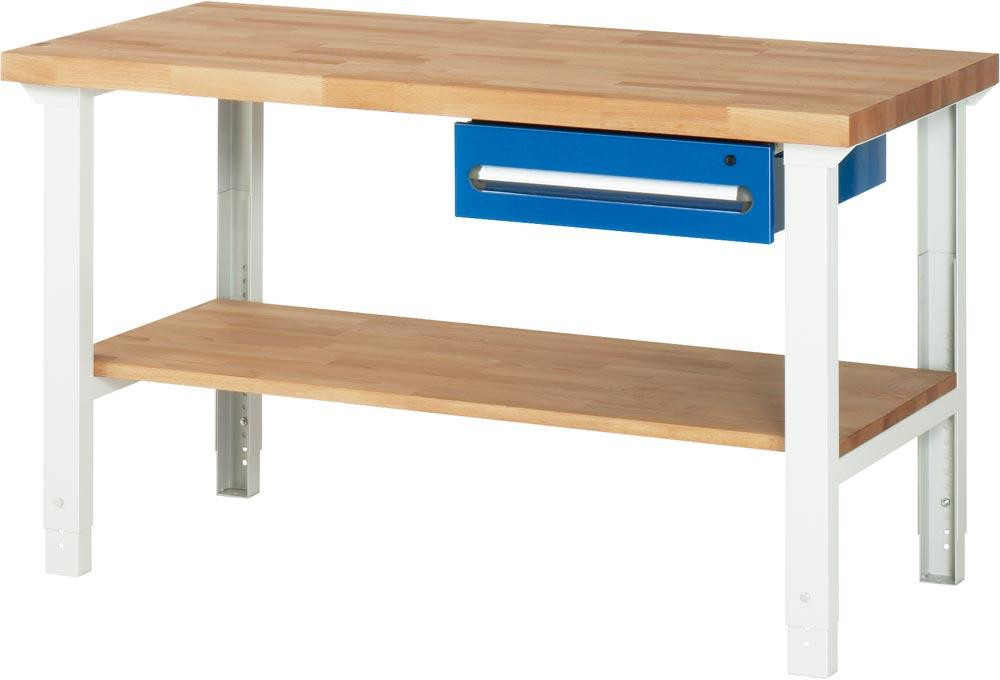 Baukastenwerkbank, Arbeitsplatte Buche massiv 40 mm, 1 Schublade 150 mm, BxTxH 2000x700x790-1140 mm, höhenverstellbar, Ablageboden T515 mm