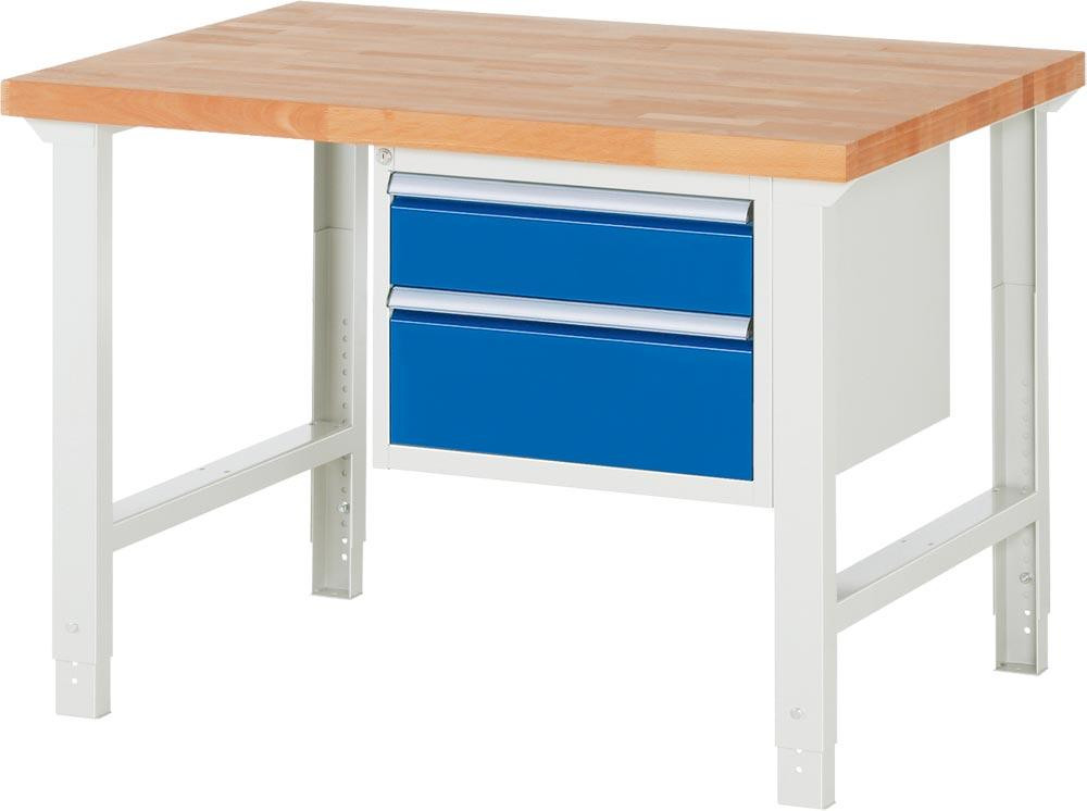 Baukastenwerkbank, Platte Buche 40 mm, 2 Schubladen:: 1x150, 1x210 mm, BxTxH 1500x900x790-1140 mm, RAL 7035/5010