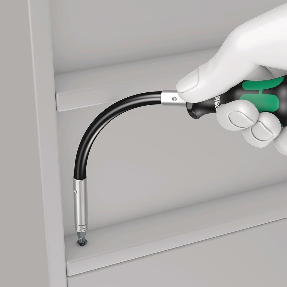 mit flexiblem Schaft · Mehrkomponenten-Kraftform-Griff mit Abrollschutz · mit kompaktem Edelstahlhalter und starkem Dauermagnet · sichere Bithaltefunktion durch Verriegelungsmechanismus · Abtrieb: 6,3 mm (1/4″)-Sechskant ISO 1173, Form C 6,3 und E 6,3