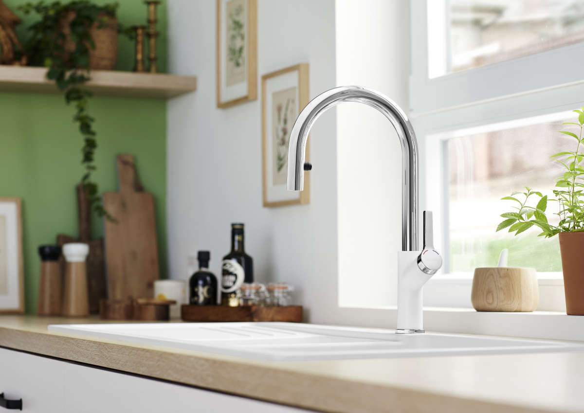 - Verdeckte, herausziehbare Zweistrahlbrause mit Umschalt-Funktion