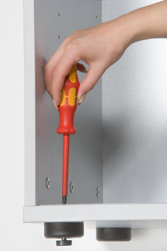 ∙ Melaminharzbeschichtete Oberflächen, blend- und reflexfrei, abriebfest und pflegeleicht ∙ Von oben verstellbare Sockelfüße zum Ausgleich von Bodenunebenheiten ∙ Hochwertige Metallbeschläge für höchste Beanspruchung · Streifengriff