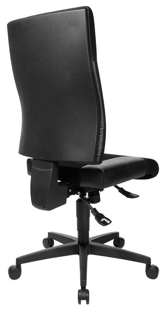 mit Synchron-Technik (ohne Armlehnen) · für überwiegend sitzende Tätigkeiten · Kunststoff-Fußkreuz schwarz · ergonomische Rückenlehne mit seitlichen Polstern zur Fixierung des Rückens · Muldensitz mit seitlichen Polstern zur Fixierung des Beckenbereichs · stufenlos höhenverstellbar · Rückenlehne in der Höhe verstellbar · Muldensitz mit seitlichem Formpolster · Bezug Rückenlehne 100 % Polyester, Sitzfläche 80 % Baumwolle, 20 % PU-Oberfläche · Sitzfläche B 480 x T 480 mm · Lehnenhöhe 550 mm · Rollen für weiche Böden Lieferung erfolgt zerlegt