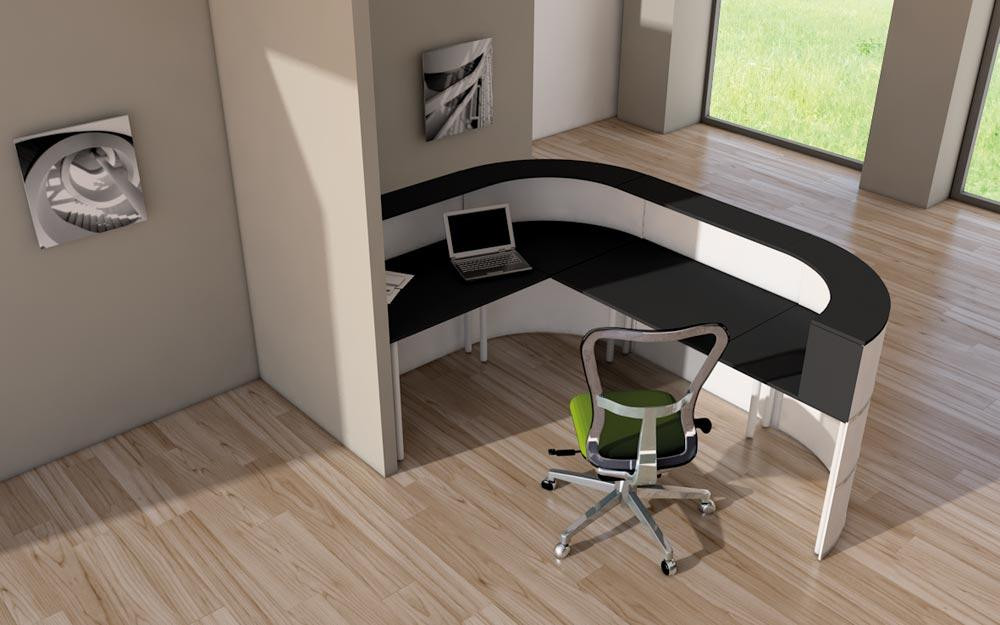 ∙ Stahl-/Holzkonstruktion ∙ Thekenkörper aus Metall in weiß mit dekorativen Edelstahlstreifen ∙ Melaminharzbeschichtete Holzplatten mit ABS-Kante in anthrazit ∙ Kabeldurchlässe in der Arbeitsplatte ∙ Hinter den 1100 mm hohen Fronten befindet sich ein vollwertiger Arbeitsplatz mit einer Tiefe von 800 mm und einer Höhe von 740 mm ∙ Beliebig erweiterbar durch Anbauelement