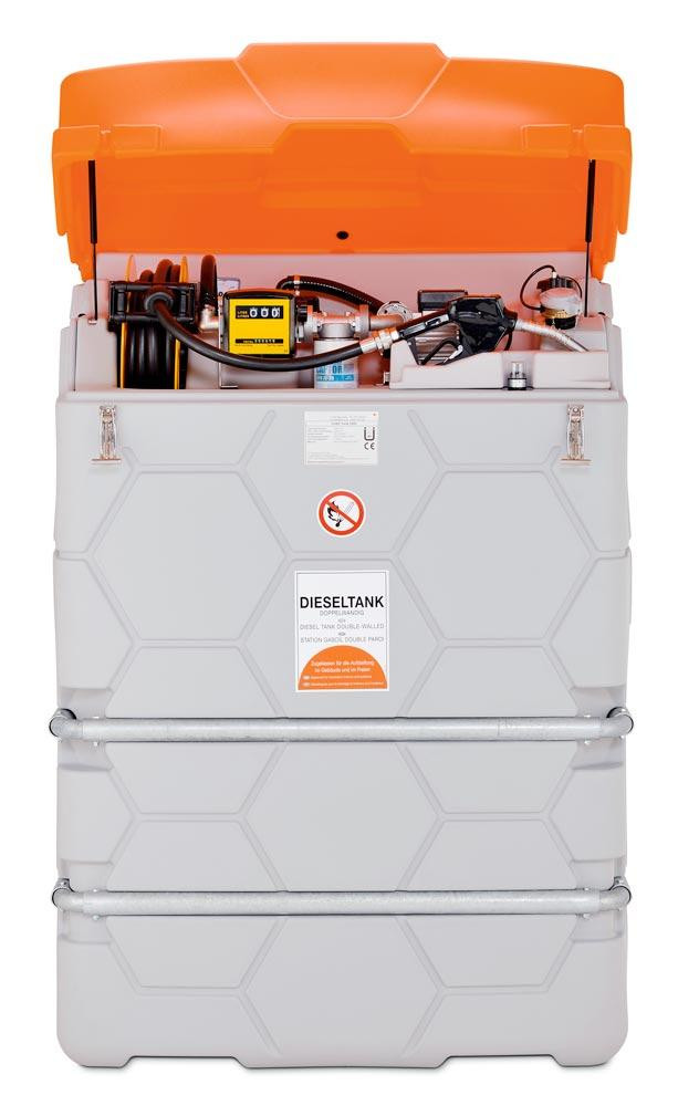 ∙ Mit integrierter Auffangwanne ∙ Optische Leckageanzeige ∙ Befüllanschluss mit TW-Kupplung und Grenzwertgeber ∙ Entlüftungsklappe ∙ Füllstandsanzeiger ∙ Elektrische Pumpe 230 V, 56 l/min ∙ Automatik Zapfpistole und Zapfpistolenhalter