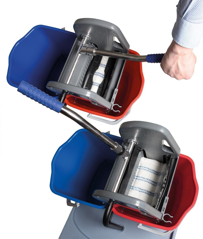 ∙ Doppelfahreimer mit Doppelbacken-Mopp-Presse ∙ Stabiler, verchromter Metallrahmen ∙ Schubbügel mit Halterung für Müllsack und geräumigem Ablagekorb ∙ Fahrwerk mit gummierten Metall-Lenkrollen und Stoßfangscheiben ∙ Fassungsvermögen 2 x 17 l ∙ Stoßfest ∙ Eimerfarbe: blau und rot