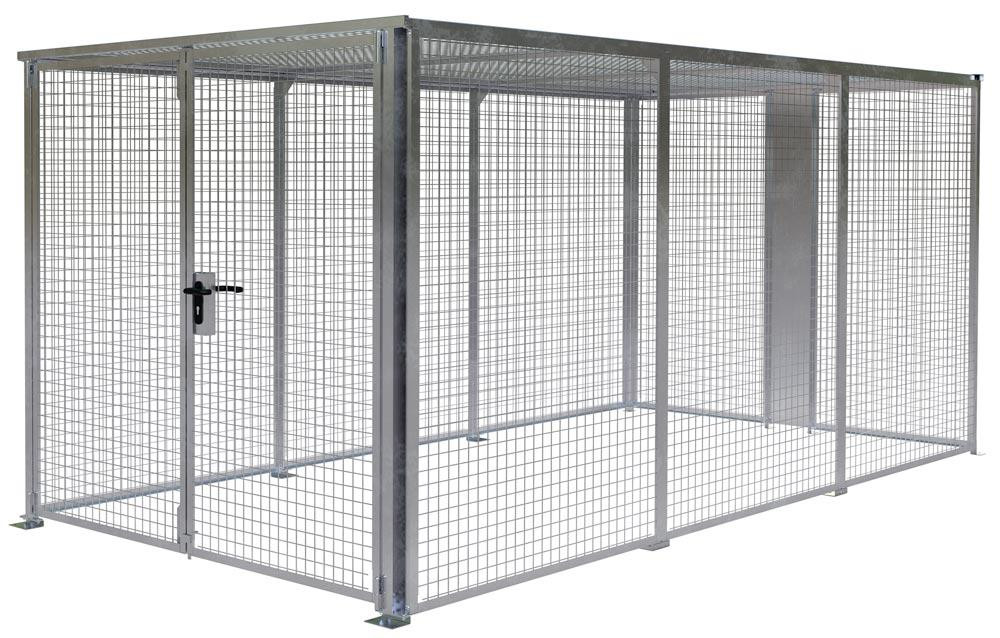 · Zur Aufbewahrung von Gütern unter Verschluss · Stabile Rahmenkonstruktion · Wände, Türen und Dach aus feuerverzinktem Drahtgitter 50 x 50 x 4,8 mm · Abschließbares Doppelflügeltor mit Drücker und Zylinderschloss, B x H 2160 x 1985 mm · Vorbereitet für Bodenbefestigung · Baukastensystem mit Aufbauanleitung zur Selbstmontage