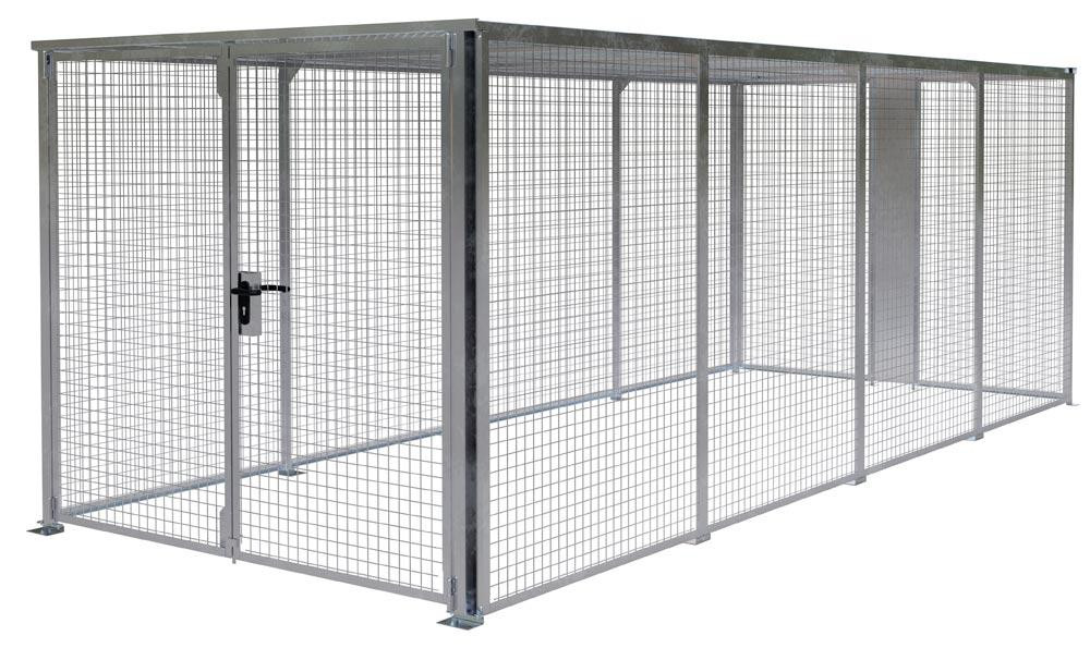· Zur Aufbewahrung von Gütern unter Verschluss · Stabile Rahmenkonstruktion · Wände, Türen und Dach aus feuerverzinktem Drahtgitter 50 x 50 x 4,8 mm · Abschließbares Doppelflügeltor mit Drücker und Zylinderschloss, B x H 2160 x 1985 mm · Vorbereitet für Bodenbefestigung · Baukastensystem mit Aufbauanleitung zur Selbstmontage