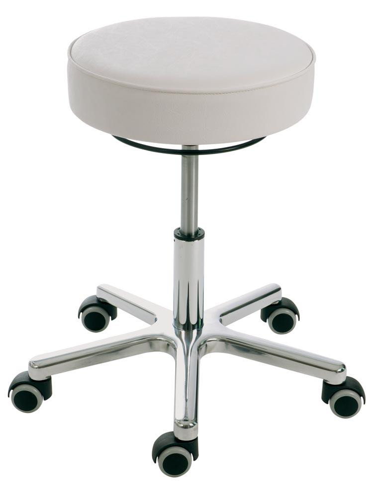 Drehhocker mit Gaslift verchromt, mit Rollen, Sitzfläche mit Kunstleder, Sitz Höhe 540-720 mm, weiß