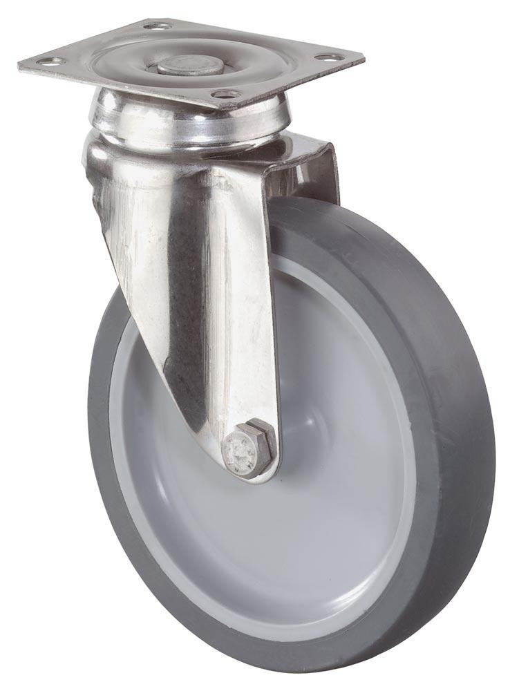 Edelstahl-Apparate-Lenkrolle, thermopl. Gummi grau, Durchm. 75 mm, Traglast 60 kg, Gleitlager, Anschraubplatte