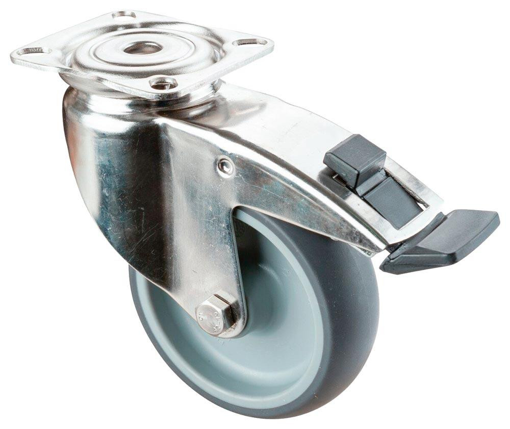 Edelstahl-Apparate-Lenkrolle m. Festst., thermopl. Gummi grau, Durchm. 125 mm, Traglast 160 kg, Gleitlager, Anschraubplatte