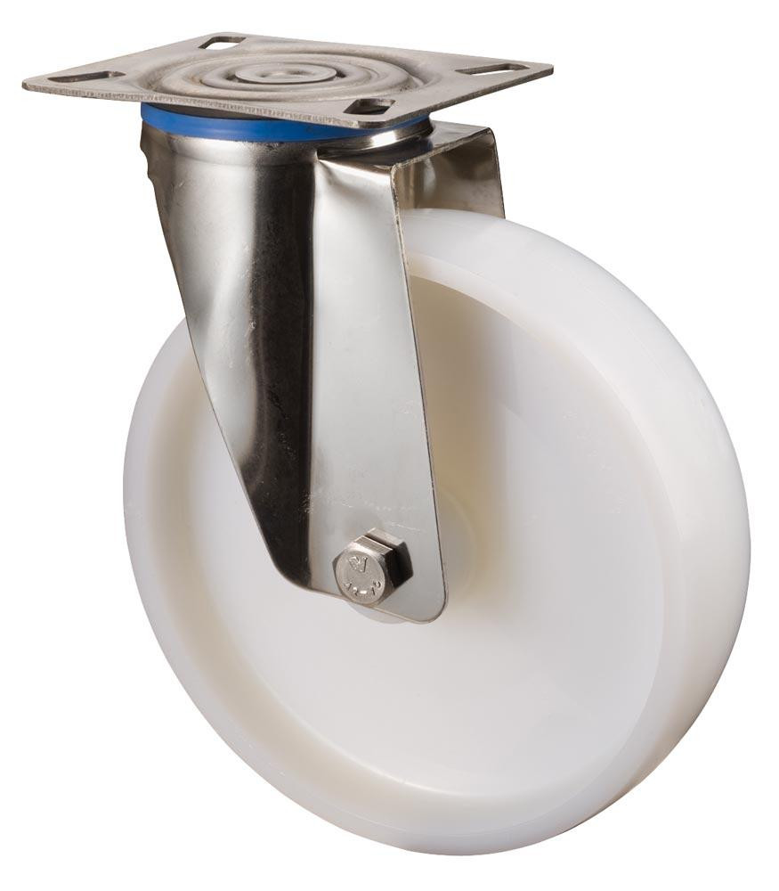 Edelstahl-Transportgeräte-Lenkrolle, Kunststoff weiß, Durchm. 80 mm, Traglast 100 kg, Gleitlager, Anschraubplatte