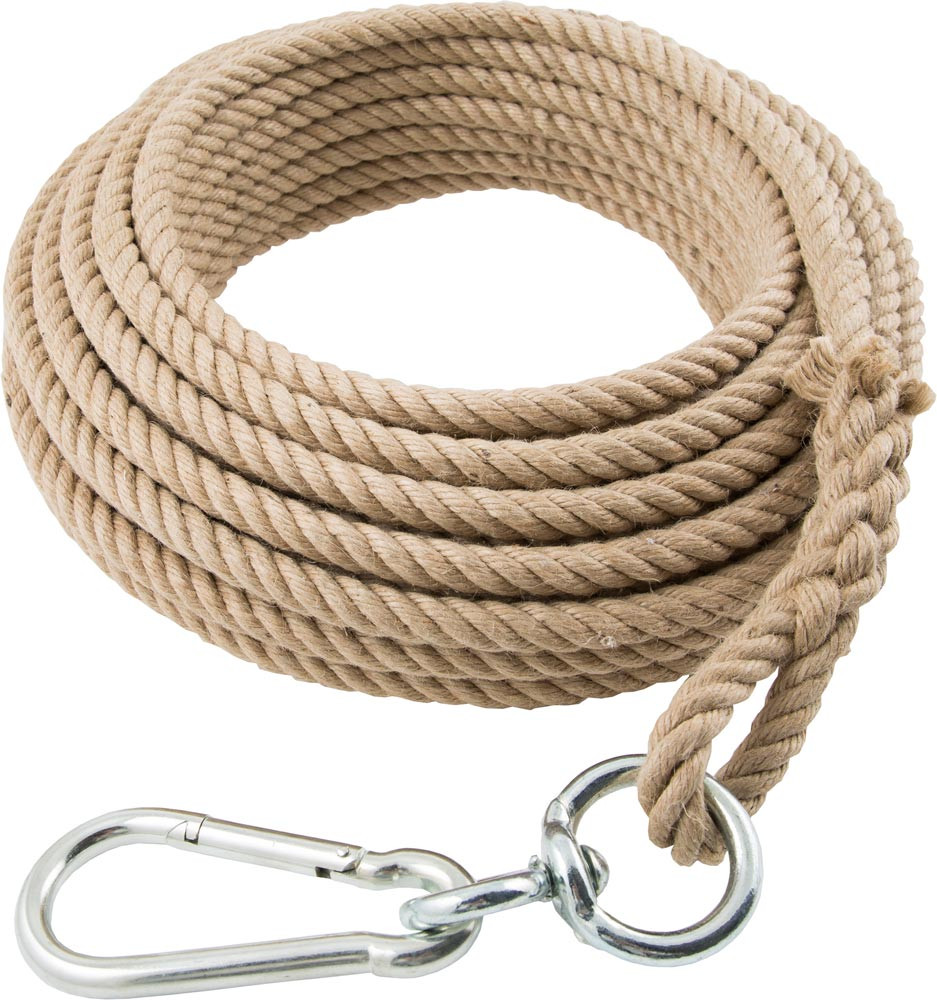 • Aus Naturfaser • 4-litzig gedreht • Mit einer Schlaufe • Mit eingespleißtem Kuhwirbel und Karabinerhaken