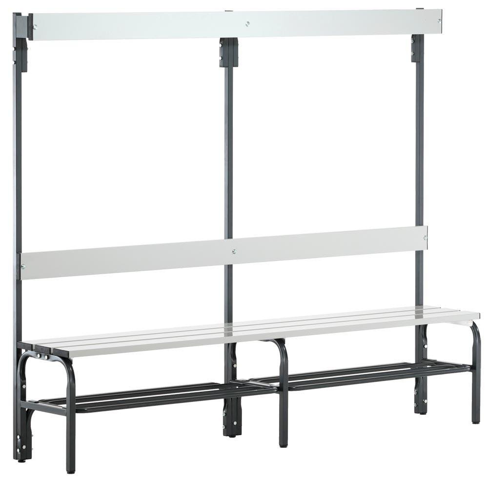 Massive Gestell-Konstruktion wahlweise aus Stahl- oder Edelstahlrohr · Gestell aus pulverbeschichteten Stahl- oder Edelstahl - Vierkant- und Rundrohr · Standardmäßig in RAL 7016 anthrazitgrau, die Edelstahlteile in RAL 7035 lichtgrau ·Sitzleisten, Rückenlehnen und Hakenleisten sind aus Aluminium und in RAL 7035 lichtgrau pulverbeschichtet · Haken- / Garderobenleisten mit verdeckt angebrachten Doppelkleiderhaken nach DIN 7917 · Sitzflächen sind vormontiert