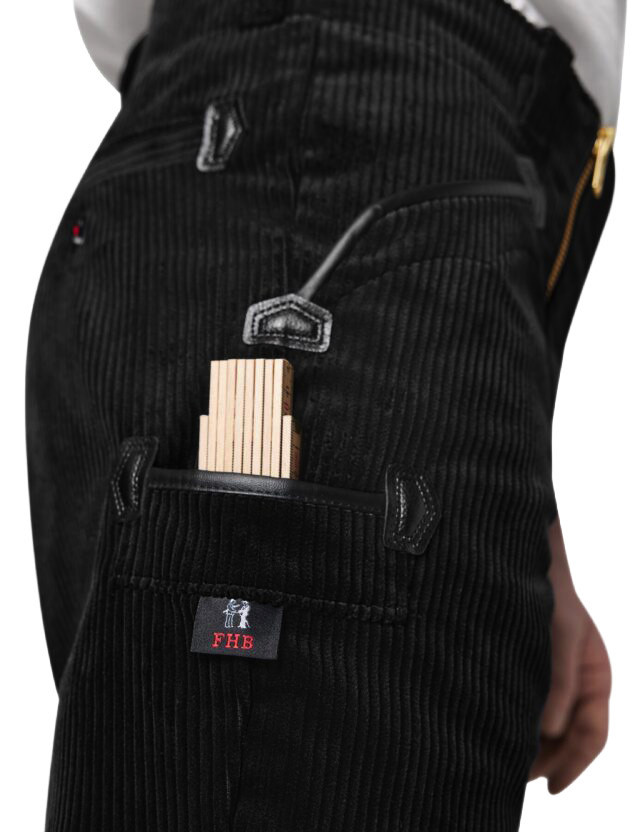 • 80 % Baumwolle / 20 % Polyester • 530 g/m2 • Knappnahtverarbeitung im Schritt • Schlagweite 65 cm • Schwere Reißverschlüsse • Geschmacksmustergeschützte Fünfecke aus Kunstleder • Zollstocktasche