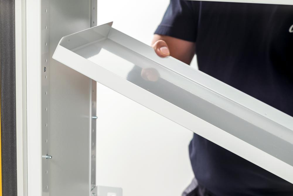 ∙ Stahlblech pulverbeschichtet RAL 7035 lichtgrau ∙ B x T x H 316 x 719 x 35 mm ∙ Traglast 50 kg