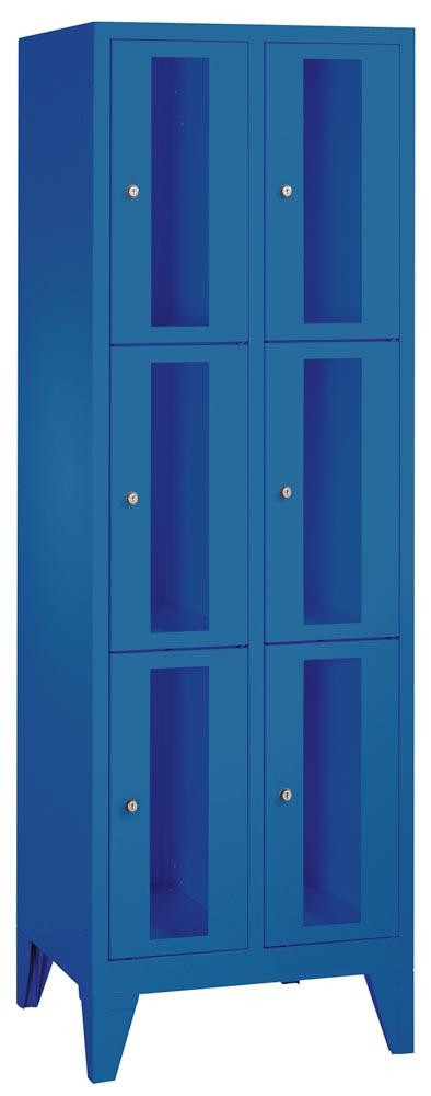 Fächerschränke mit Füßen und Sichtfenstertüren, 2x3 Fächer, Schloss, BxTxH 610x500x1850 mm, Abt. B 300 mm, RAL 5010