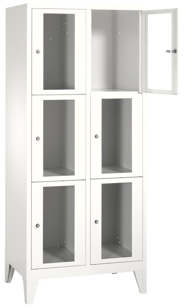 Fächerschränke mit Füßen und Sichtfenstertüren, 2x3 Fächer, Schloss, BxTxH 810x500x1850 mm, Abt. B 400 mm, RAL 7035