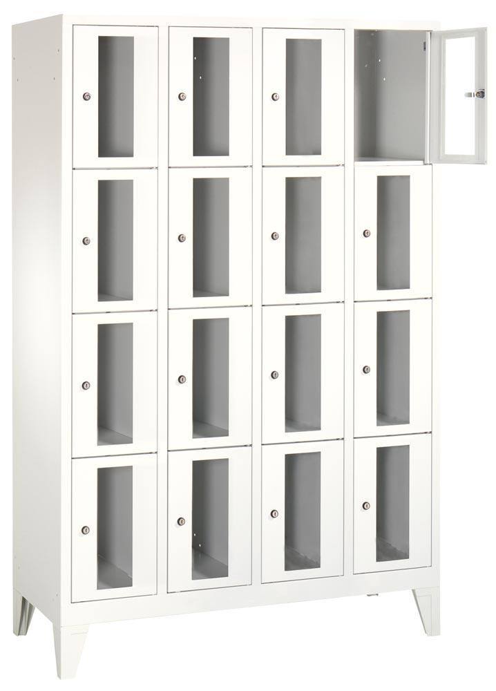 Fächerschränke mit Füßen und Sichtfenstertüren, 4x4 Fächer, Schloss, BxTxH 1190x500x1850 mm, Abt. B 300 mm, RAL 7035