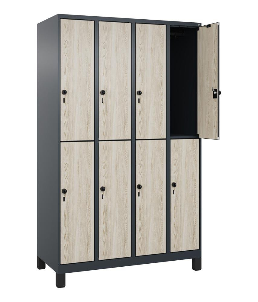 Fächerschrank, doppelstöckig, Füße, 4x2 Fächer, Abt.B 300 mm, BxTxH 1200x500x1950 mm, HPL-Dekorfront, RAL 7016/Dekor Sen Esche