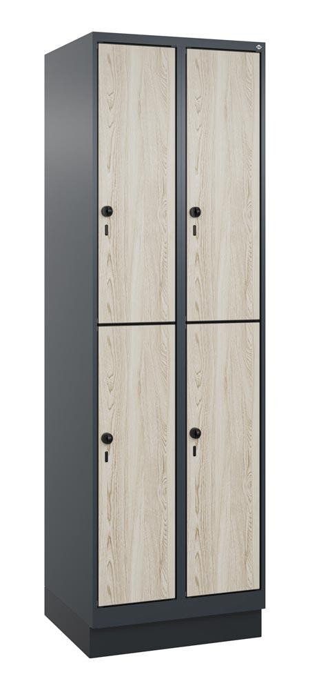 Fächerschrank, doppelstöckig, Sockel, 2x2 Fächer, Abt.B 300 mm, BxTxH 600x500x1950 mm, HPL-Dekorfront, RAL 7016/Dekor Sen Esche