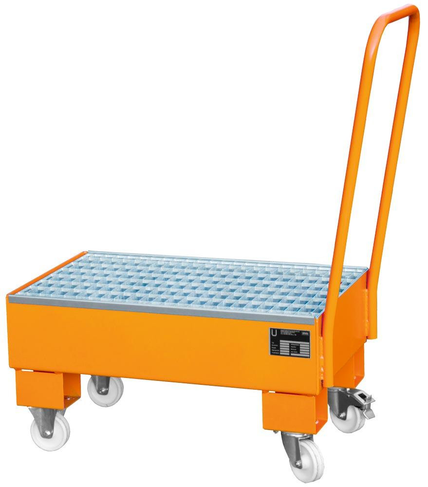 ∙ Mobile Lagerung von 60-l-Fässern ∙ Auffangwanne aus 3 mm Stahlblech inkl. verzinktem, herausnehmbaren Gitterrost ∙ Traglast 1000 kg/m2 ∙ Schiebegriff ∙ 2 Lenk- und 2 Bockrollen aus Polyamid Ø 100 mm, Bauhöhe 125 mm, davon 1 Lenkrolle mit Feststeller