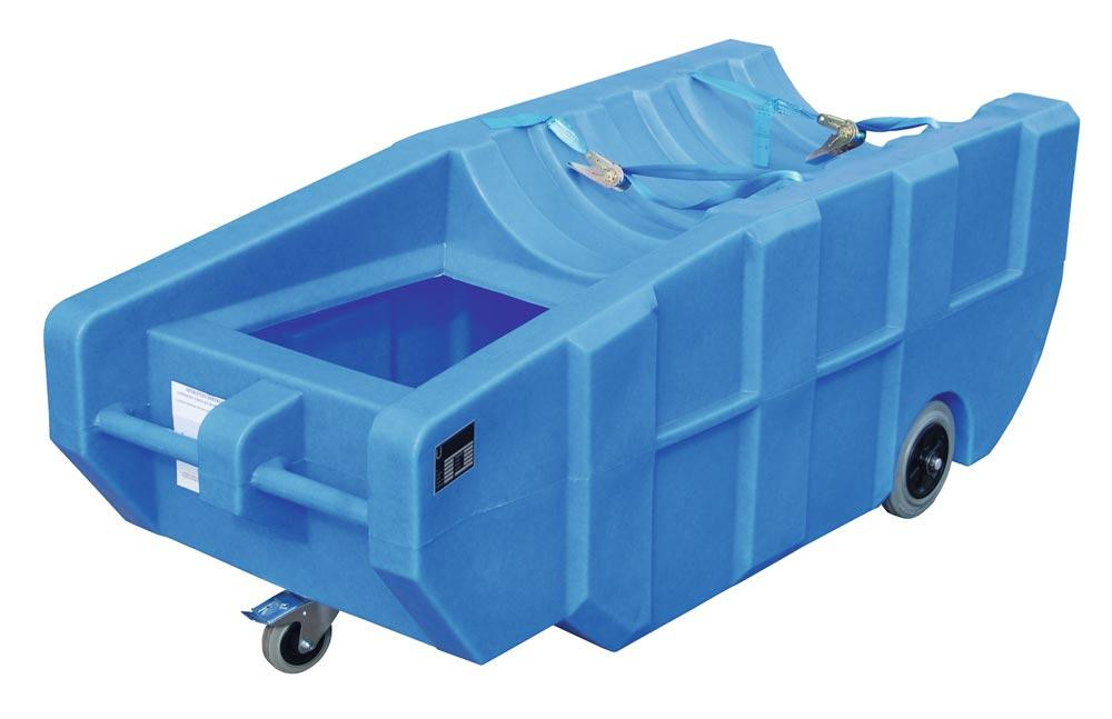 Fahrbarre Polyethylen-Auffangwanne, BxTxH 740x1600x640 mm, blau, Lagerung u.Transport 200-l-Fass, Auffangvolumen 230 l, Gewicht 44 kg, Traglast 300 kg