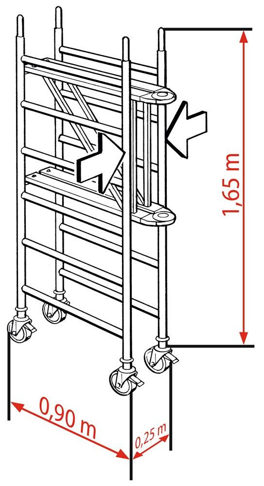 ∙ Kompakt und Platzsparend ∙ Äußerst stabil ∙ Mit großer Arbeitsbühne L x B 1900 x 650 mm ∙ Aufbau optional mit Höhenversatz z. B. in Treppenstellung ab Größe ∙ Zulässige Belastung 200 kg/m2 ∙ 4 Lenkrollen Ø 125 mm (ab Größe Ø 150 mm) ∙ Nach EN 1004