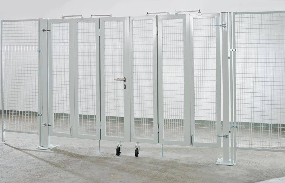 · Optimaler Schutz in Bereichen mit wenig Platz · Flachgittermaschung 40 x 40 mm in Rahmenprofil 60/40 mm eingefasst · Direkt in das Trennwandsystem integrierbar · Leichtes Öffnen und Schließen durch drehbare Räder · Komplett ausgestattet mit Torrahmenschloss und Drückergarnitur · Inkl. stabiler QR-Pfosten und verstellbarer Torbänder · Farbe RAL 7037 staubgrau