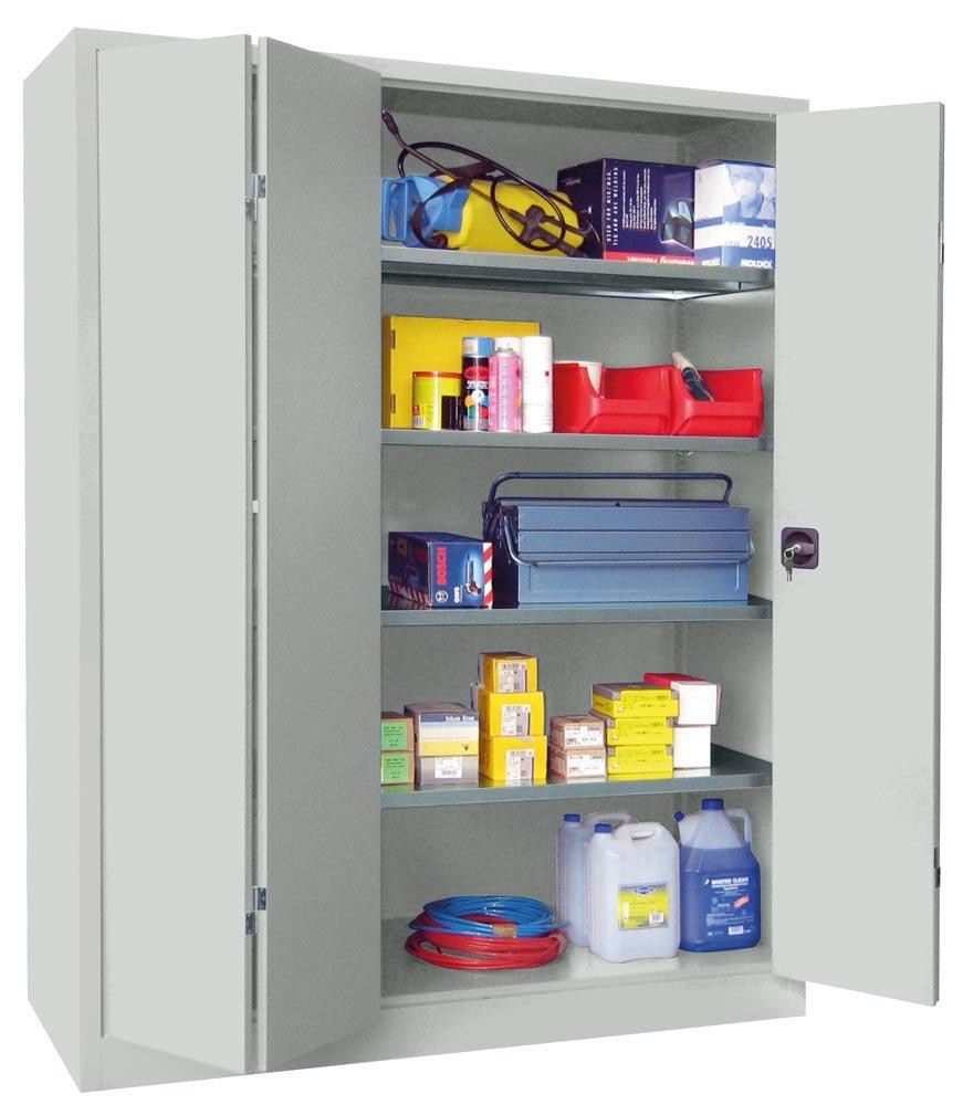 ∙ Stabile Stahlblechkonstruktion ∙ Oberfläche pulverbeschichtet ∙ Schränke mit gemeinsam verschließbaren Vollblech-Falttüren und Verstärkungstaschen ∙ Die Türen sind über einen dreiriegeligen Drehgriff mit integriertem Zylinderschloss inkl. 2 Schlüsseln verschließbar ∙ Böden im Raster von 17 mm höhenverstellbar, Belastbarkeit je Boden 80 kg bei gleichmäßig verteilter Last ∙ Max. Gehäusebelastbarkeit 600 kg