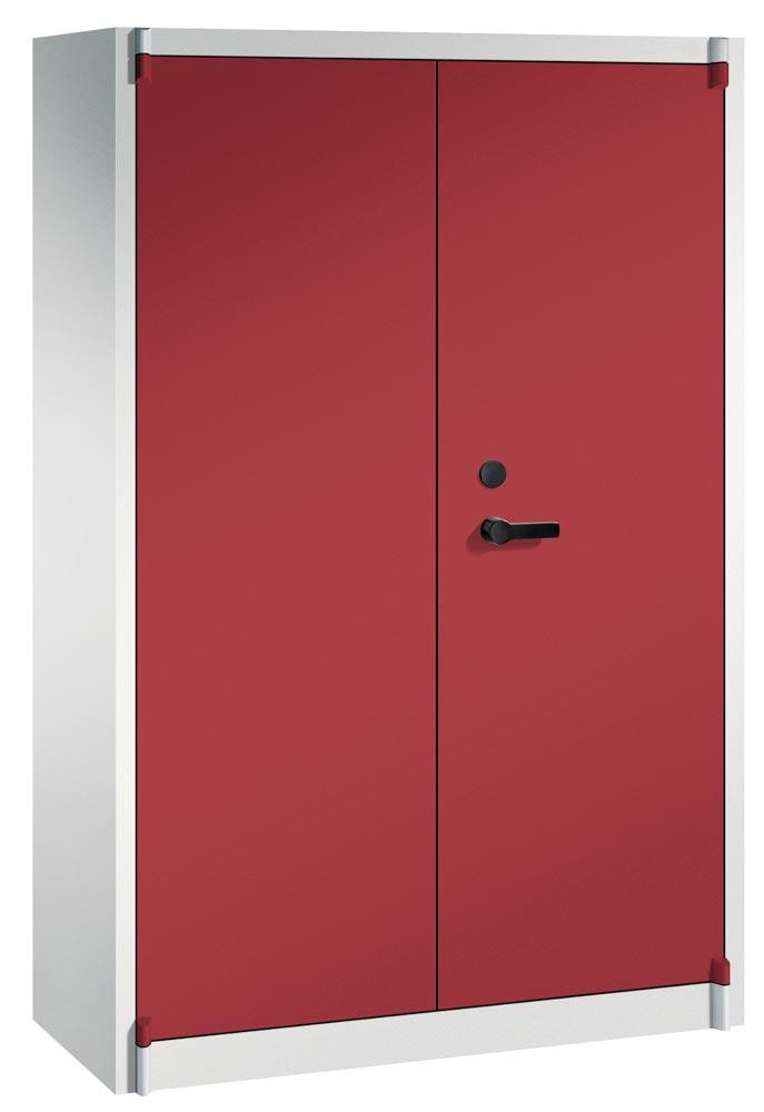 Feuergeschützter Flügeltürenschrank, BxTxH 1200x500x1950 mm, 2-türig, 4 Fachböden, RAL 7035/3003 lichtgrau/rubinrot