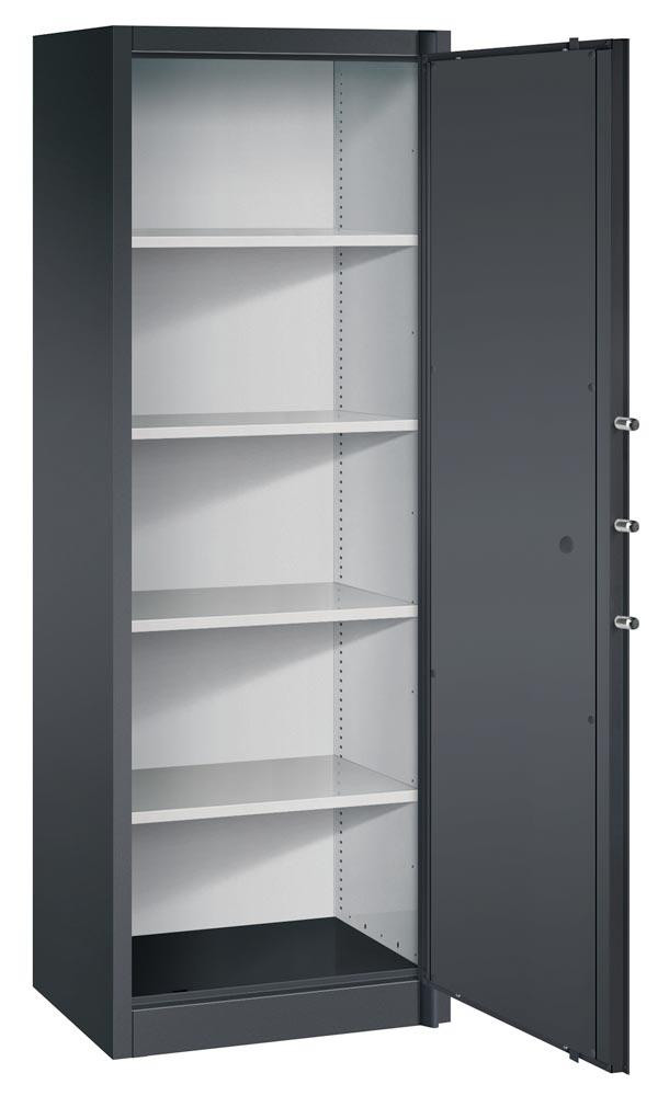 · Allseitig doppelwandig, zwischen den Wandungen 25 mm starke Spezial-Isolierplatten Klasse A1, nicht brennbar nach DIN 4102 · Flügeltüren lagern oben und unten in stabilen Drehbolzen · Links und rechts je 3 Sicherungsbolzen, die in die Seitenwände einrasten · 5-riegeliges Bolzenriegelwerk (seitlich 3 x, oben/unten je 1 x) · Doppelbart-Sicherheitsschloss mit 2 Schlüsseln · Schrankgriffe in schwarz · Traglast pro Einlegeboden ca. 70 kg (bei gleichmäßig verteilter Last) ∙ Halbhohe Schränke mit DBS-Abdeckplatte, lichtgrau