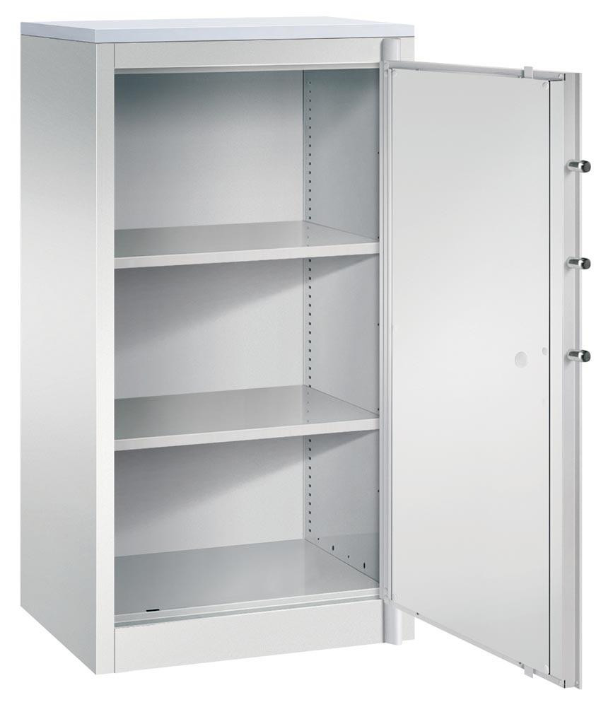 · Allseitig doppelwandig, zwischen den Wandungen 25 mm starke Spezial-Isolierplatten Klasse A1, nicht brennbar nach DIN 4102 · Flügeltüren lagern oben und unten in stabilen Drehbolzen · Links und rechts je 3 Sicherungsbolzen, die in die Seitenwände einrasten · 5-riegeliges Bolzenriegelwerk (seitlich 3 x, oben/unten je 1 x) · Doppelbart-Sicherheitsschloss mit 2 Schlüsseln · Schrankgriffe in schwarz · Traglast pro Einlegeboden ca. 70 kg (bei gleichmäßig verteilter Last) ∙ Halbhohe Schränke mit DBS-Abdeckplatte, lichtgrau