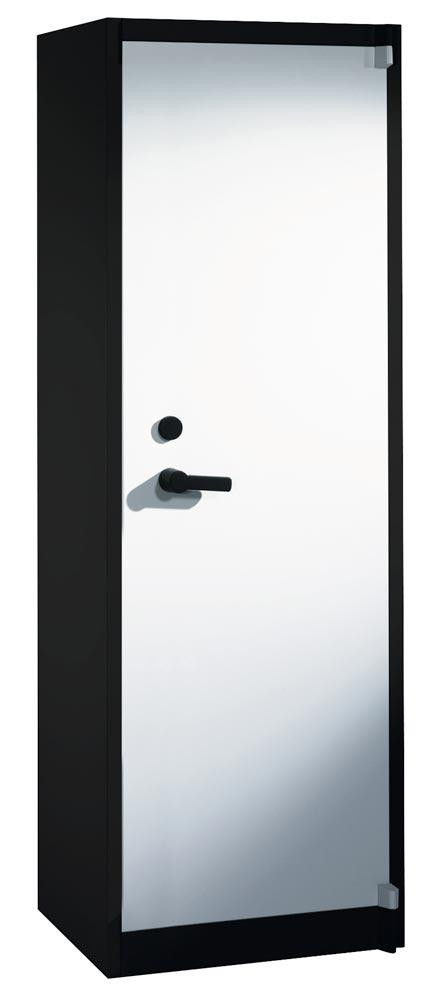 · Allseitig doppelwandig, zwischen den Wandungen 25 mm starke Spezial-Isolierplatten Klasse A1, nicht brennbar nach DIN 4102 · Flügeltüren lagern oben und unten in stabilen Drehbolzen · Links und rechts je 3 Sicherungsbolzen, die in die Seitenwände einrasten · 5-riegeliges Bolzenriegelwerk (seitlich 3 x, oben/unten je 1 x) · Doppelbart-Sicherheitsschloss mit 2 Schlüsseln · Schrankgriffe in schwarz · Traglast pro Einlegeboden ca. 70 kg (bei gleichmäßig verteilter Last) ∙ Halbhohe Schränke mit DBS-Abdeckplatte, lichtgrau