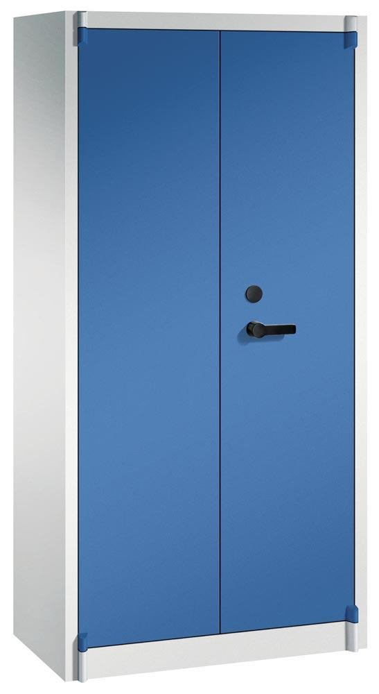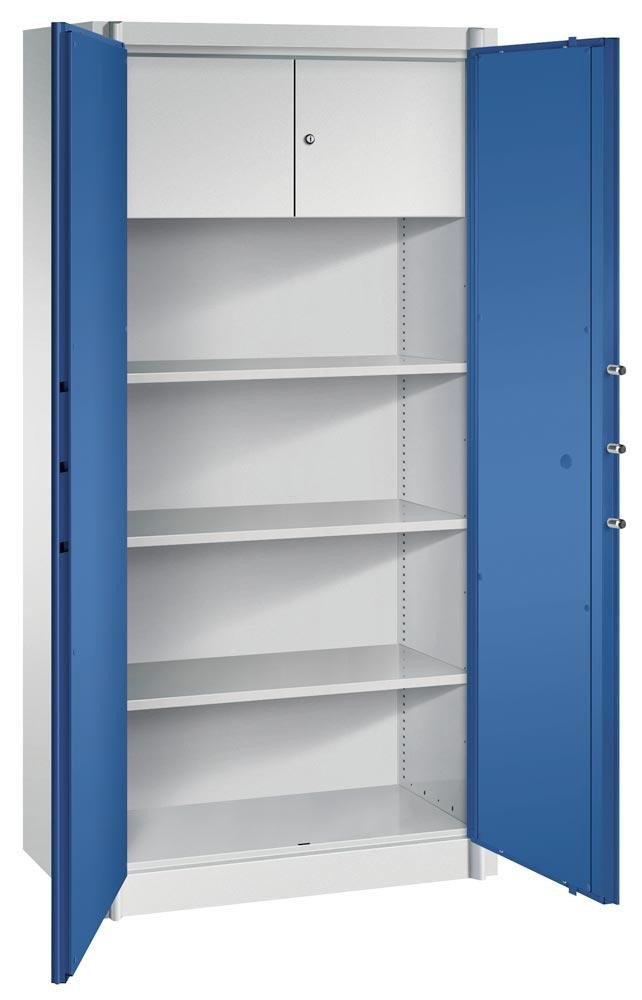 Feuergeschützter Flügeltürenschrank, BxTxH 930x500x1950 mm, 2-türig, 3 Fachböden, 1 Schließfach, RAL 7035/5010 lichtgrau/enzianblau