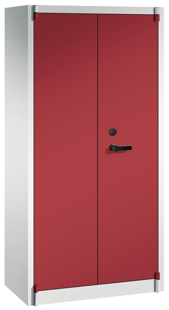 Feuergeschützter Flügeltürenschrank, BxTxH 930x500x1950 mm, 2-türig, 3 Fachböden, 2 Schließfächer, RAL 7035/3003 lichtgrau/rubinrot