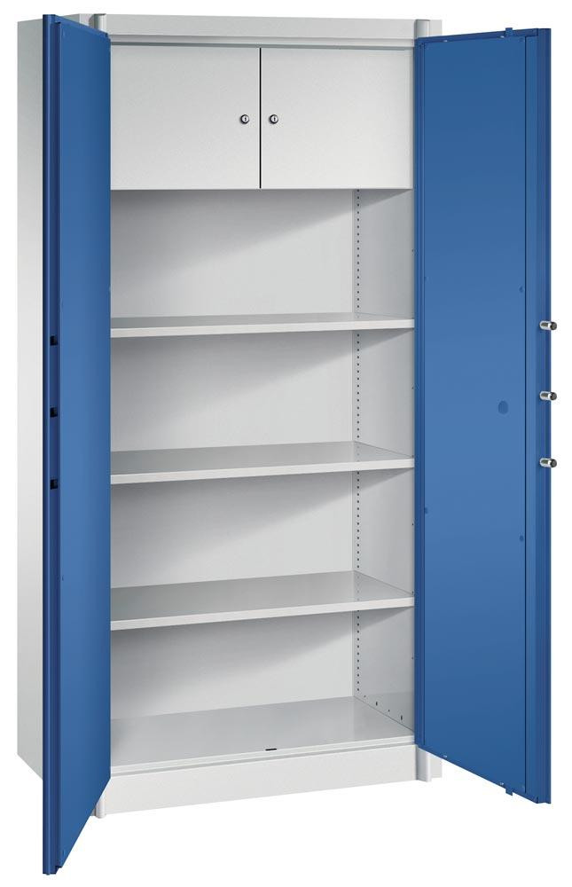 Feuergeschützter Flügeltürenschrank, BxTxH 930x500x1950 mm, 2-türig, 3 Fachböden, 2 Schließfächer, RAL 7035/5010 lichtgrau/enzianblau