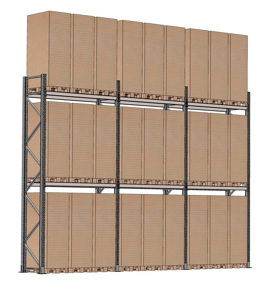 ∙ Feuerverzinkte Oberflächenbeschichtung ∙ Für die Lagerung von Europaletten mit einer Palettenhöhe von max. 2530 mm ∙ Palettengewicht bis 1000 kg ∙ Warmgewalzte IPE-Holme mit 5 Agaffenhaken ∙ Schraubenanker inkl. Folienpatrone ∙ Mindestanforderung: 3 Felder mit mindestens je 2 Holmebenen