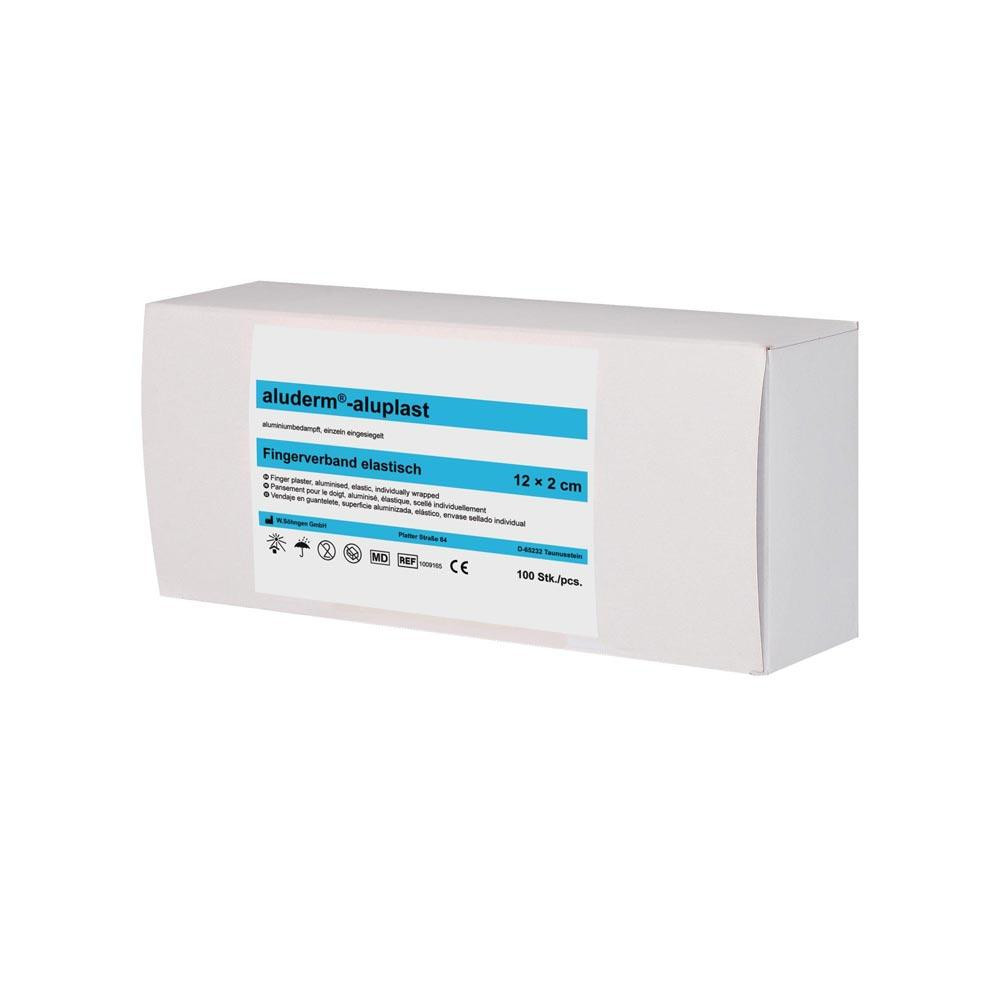 Ausführung: Faltschachtel mit 100 St. aluderm®-aluplast Fingerverbänden ca. 12 x 2 cm, mit aluminiumbedampfter aluderm®-Wundauflage und Saugvlies ∙ Aluderm®-aluplast verklebt nicht mit der Wunde, fasert nicht, ist stark saugend, kann bei der Hautbildung und Heilung helfen und ist atmungsaktiv