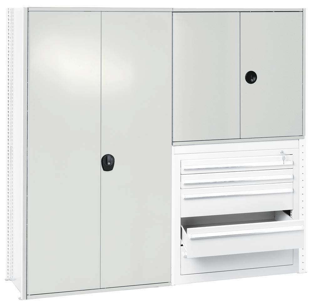 · Zur Montage eines geschlossenen Schrankes · Robuste Kastenkonstruktion aus Stahlblech, kunststoffbeschichtet in RAL 7035 lichtgrau · Türen mit Kastenversteifung und Mehrfachkantung · Drehgriff mit 3-Punktverschluss mit Zylinderschloss
