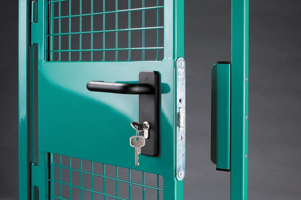 ∙ Rahmen aus C-Profil 30 x 30 x 2 mm mit eingeschweißtem Drahtgitter 40x40x3,8 mm ∙ Querriegel als Schlosskasten ∙ Mit Scharnierbändern und Anschlag rechts oder links mit Schließblech ∙ Komplett mit Schloss und Drückergarnitur, jedoch ohne Schließzylinder