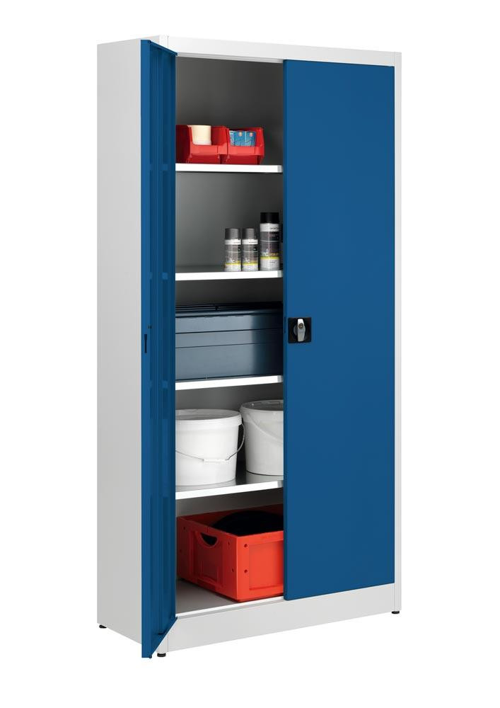 Flügeltürenschrank, 4 verz. Fachböden BxTxH 950x420x1965 mm, RAL7035 lichtgrau/RAL5010 enzianblau